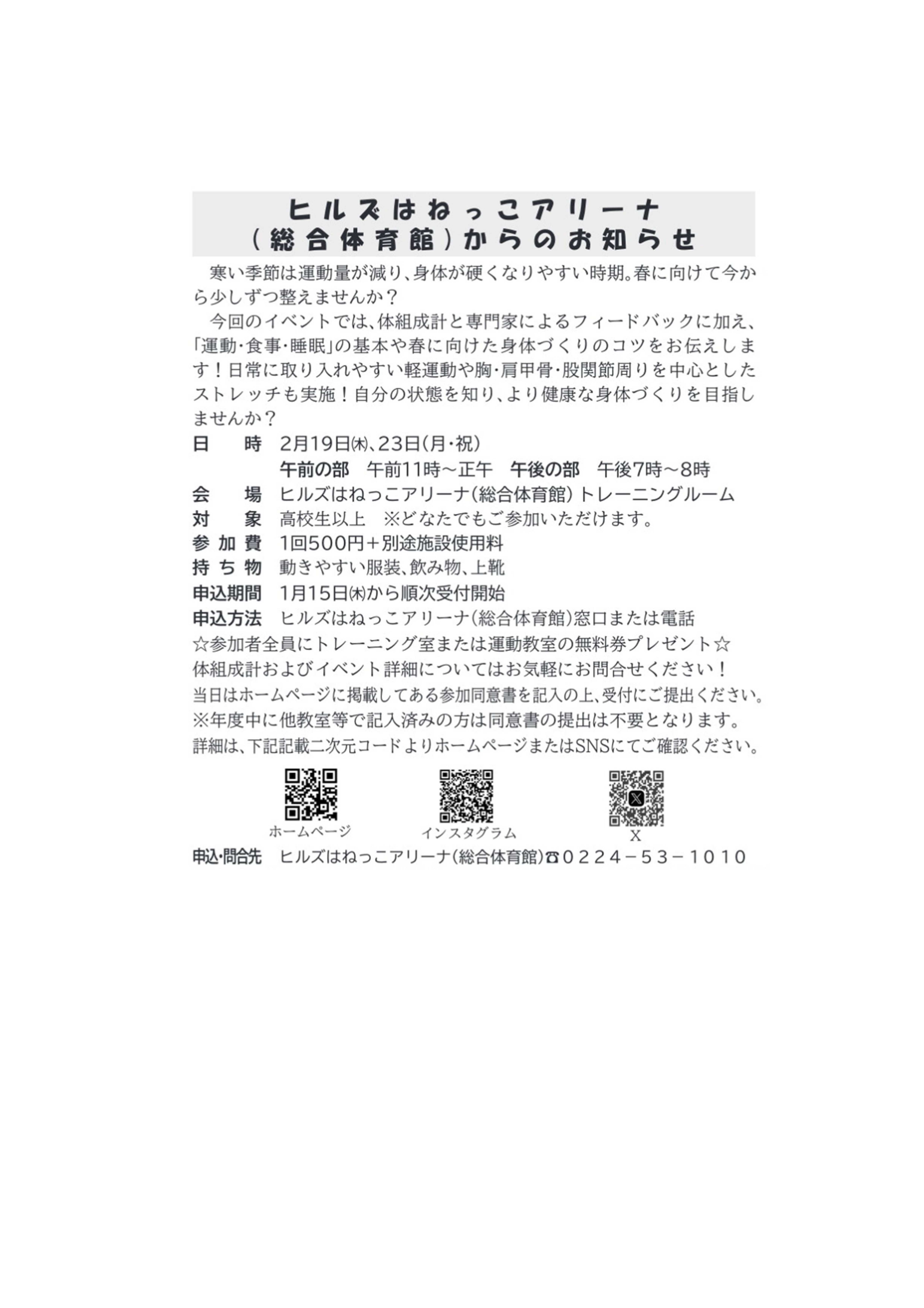 ヒルズはねっこアリーナ(総合体育館)からのお知らせ