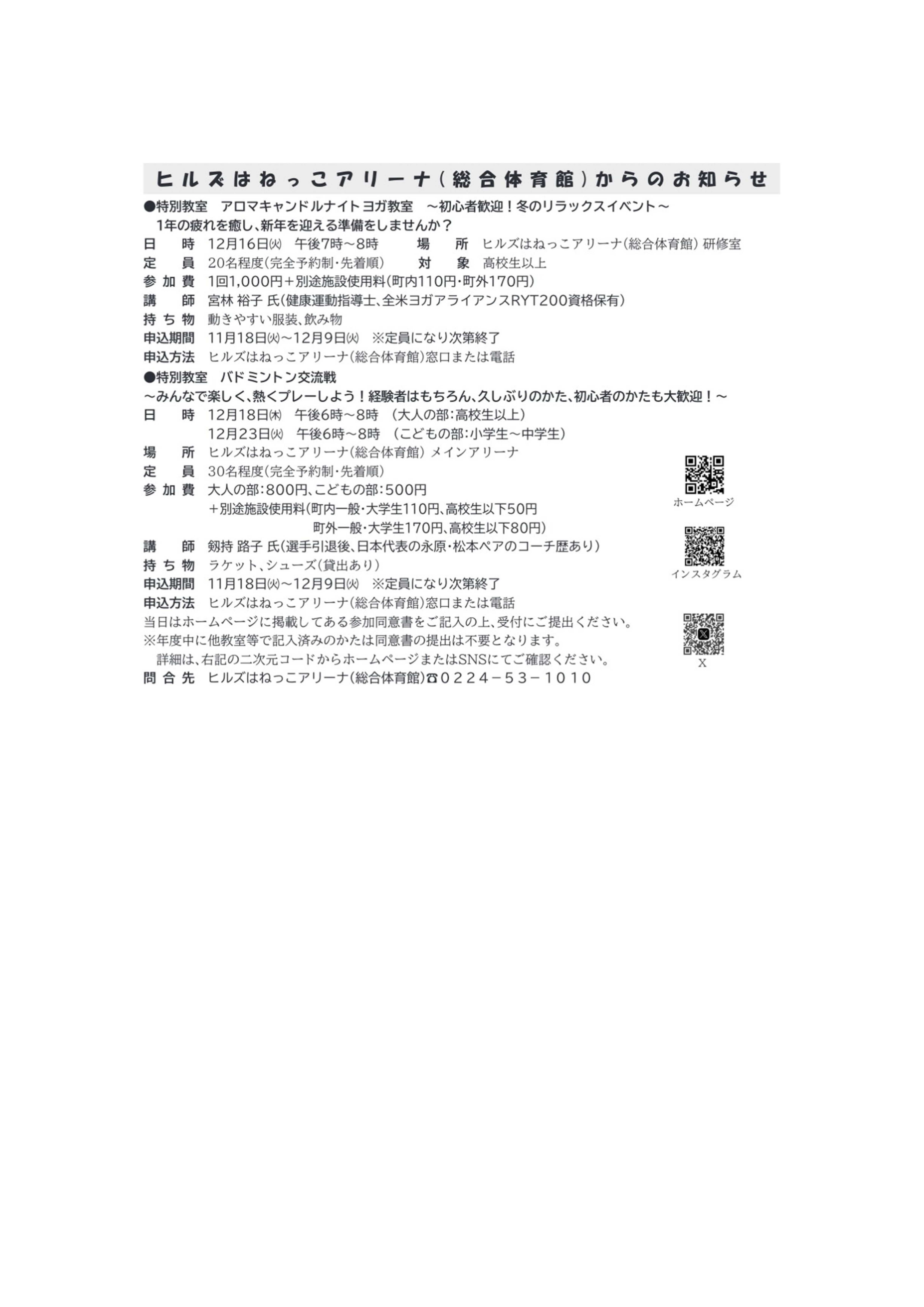 ヒルズはねっこアリーナ(総合体育館)からのお知らせ